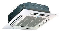 Кассетные фанкойлы выпускаются с внешней панелью для монтажа в фальш-потолок. Четырехтрубные фанкойлы содержат два теплообменника. В один из них поступает теплоноситель от чиллера, другой подключается к центральной системе отопления. Фанкойлы этого типа могут быть использованы зимой в качестве основного источника отопления.