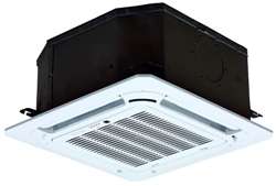Кассетные фанкойлы выпускаются с внешней панелью для монтажа в фальш-потолок. Четырехтрубные фанкойлы содержат два теплообменника. В один из них поступает теплоноситель от чиллера, другой подключается к центральной системе отопления. Фанкойлы этого типа могут быть использованы зимой в качестве основного источника отопления.